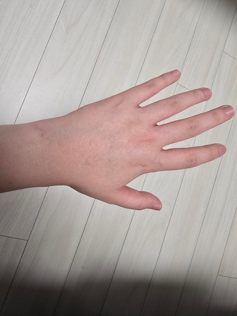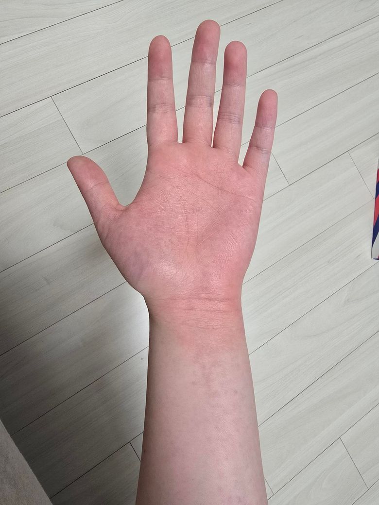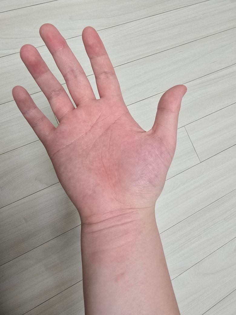 손가락 사이부터 손바닥 손목까지는 빨갛고 열감이 있으면서 간지럽고 따가웠어요. 시간이 지나면서 두드러기처럼 올라왔어요.