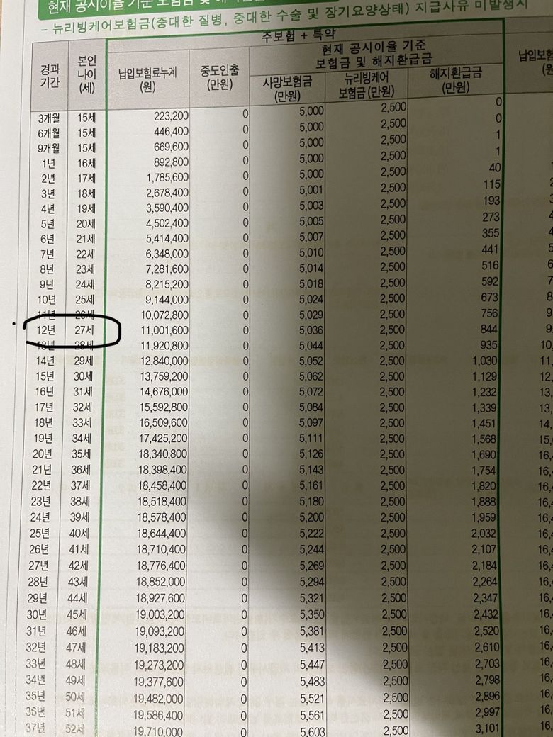 12년 동안 납입 한 보험료가 1100만원 이고 지급 해지 한다고 하면 844만원을 환급 받을 수 있네요