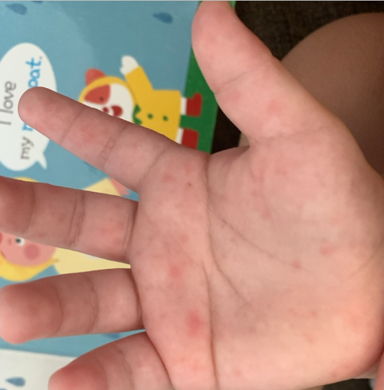 아이 손에 이런 두드러기가 생겼습니다. 미열도 살짝 있습니다. 열은 37.4도.