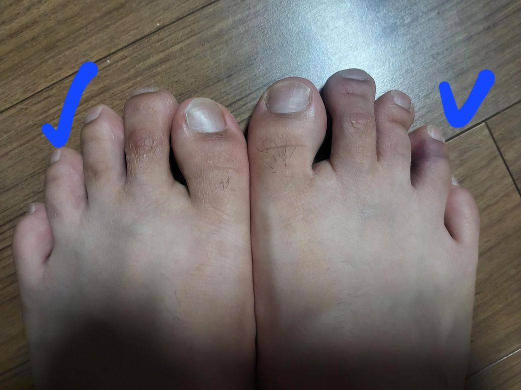 지금은 타박상에 의한 연부조직 손상으로 보여지지만 발가락 같이 작은 뼈들은 작은 충격에도 충분히 골절이 될 수 있으니 검사를 해보시길 바랍니다.