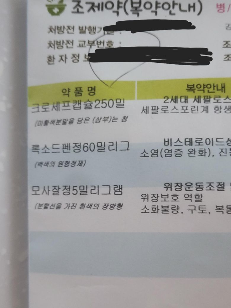 봉합은 어려워 소독, 파상풍 주사 놔주시고 항생제 + 소염진통제 + 위장약 처방받아 복용 중입니다.