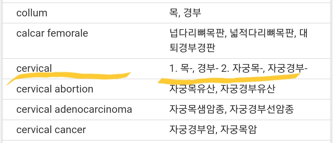 항목처럼 1번 뜻은 목을 뜻하지만 아까 말한 약어들처럼 워낙 자궁목을 말할때 cervix를 자궁경부로 지칭하는 경우가 많아 자궁경부를 지칭하는 경우가 많습니다.