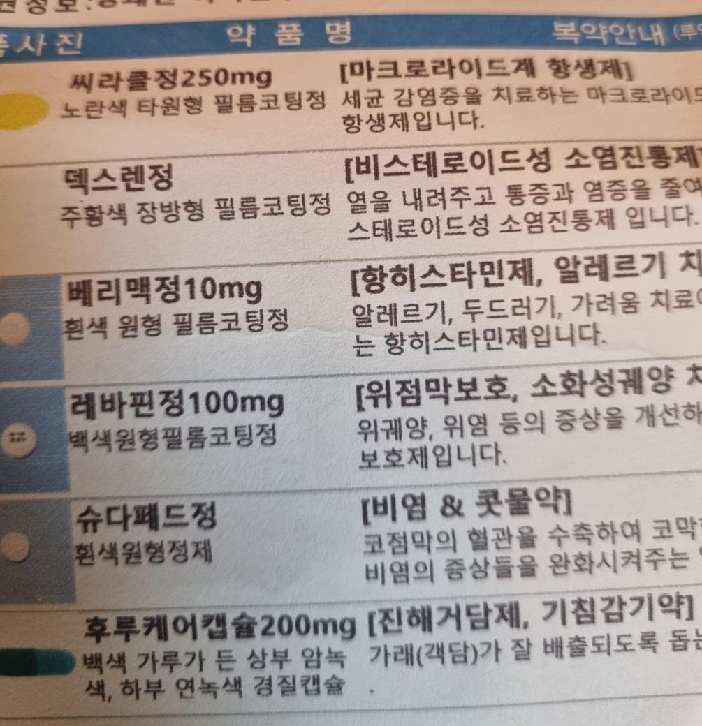 걸렸습니다 점심에 먹는약 한번 먹었는데 항생제와 항히스타민제는 빠져있었습니다