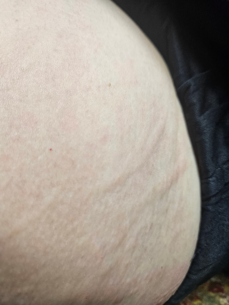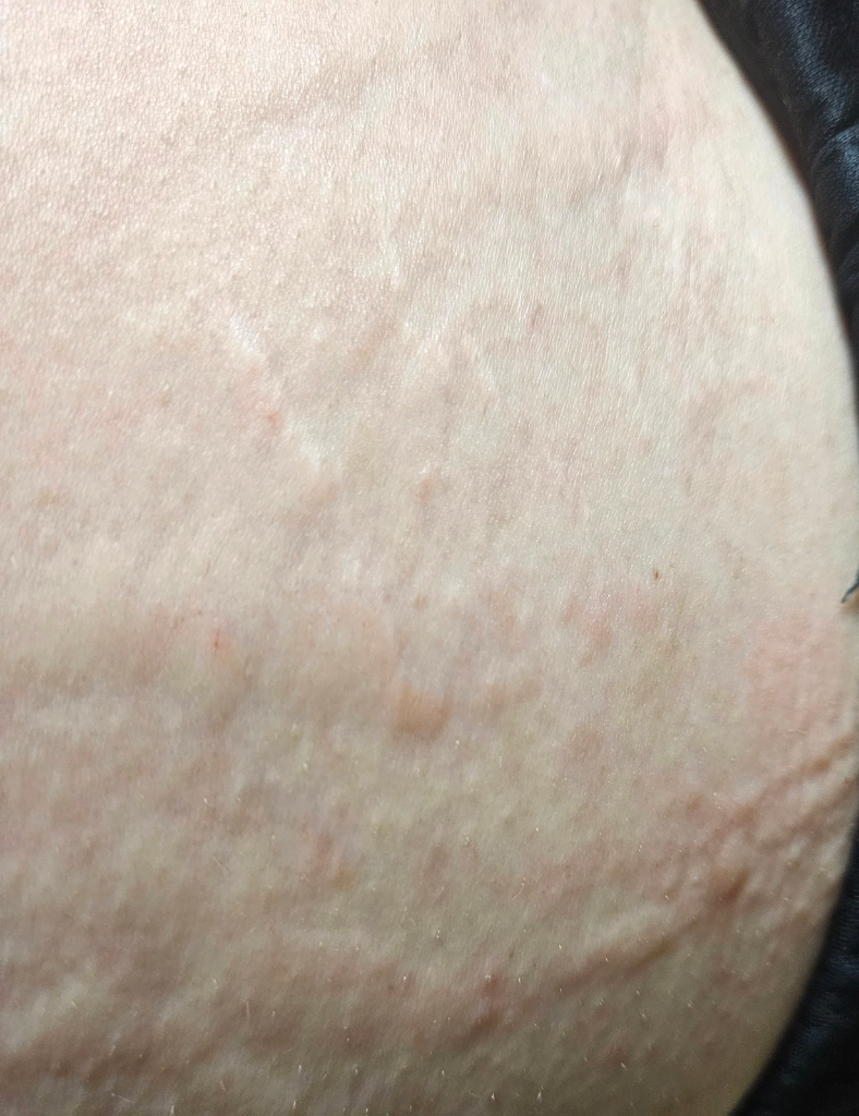 두드러기의 일정으로 피부를 어느 정도 이상의 압력을 주어 긁거나 누르면, 그 부위에 국한되어 두드러기와 유사하게 가렵고 붉게 변하면서 부어 오르게 됩니다.