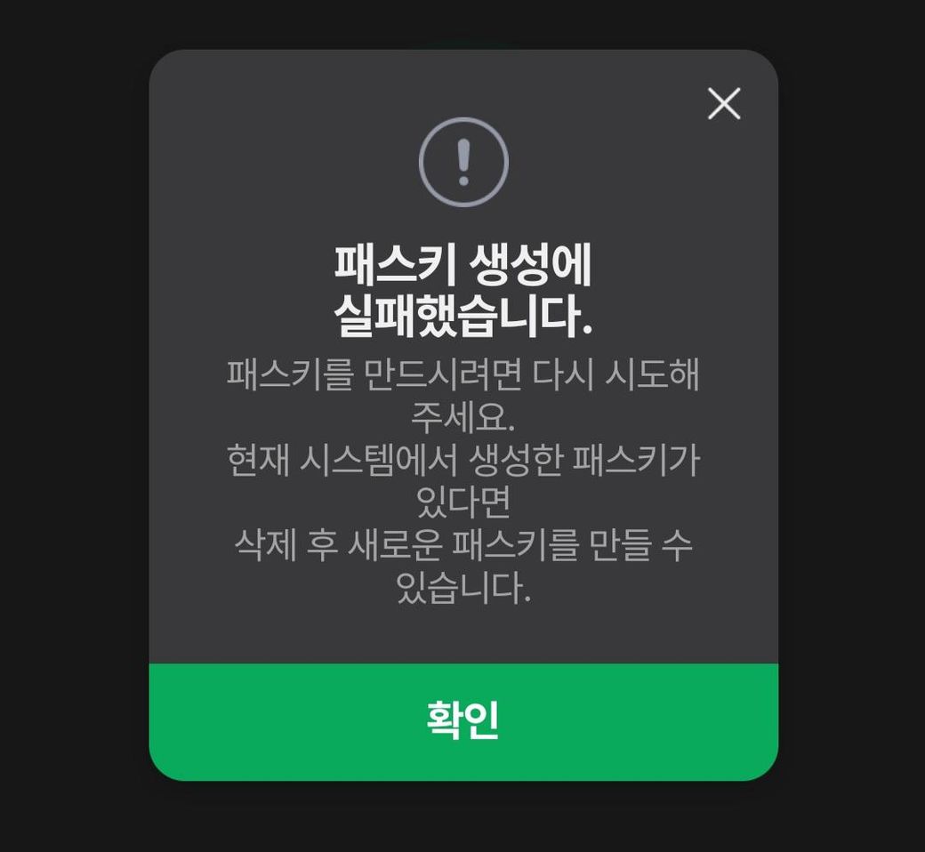 비밀번호 또는 보안 설정을 변경한 직후에는 일정 시간 동안 패스키 생성이 제한될 수 있습니다. 잠시 기다렸다가 다시 시도해보세요.