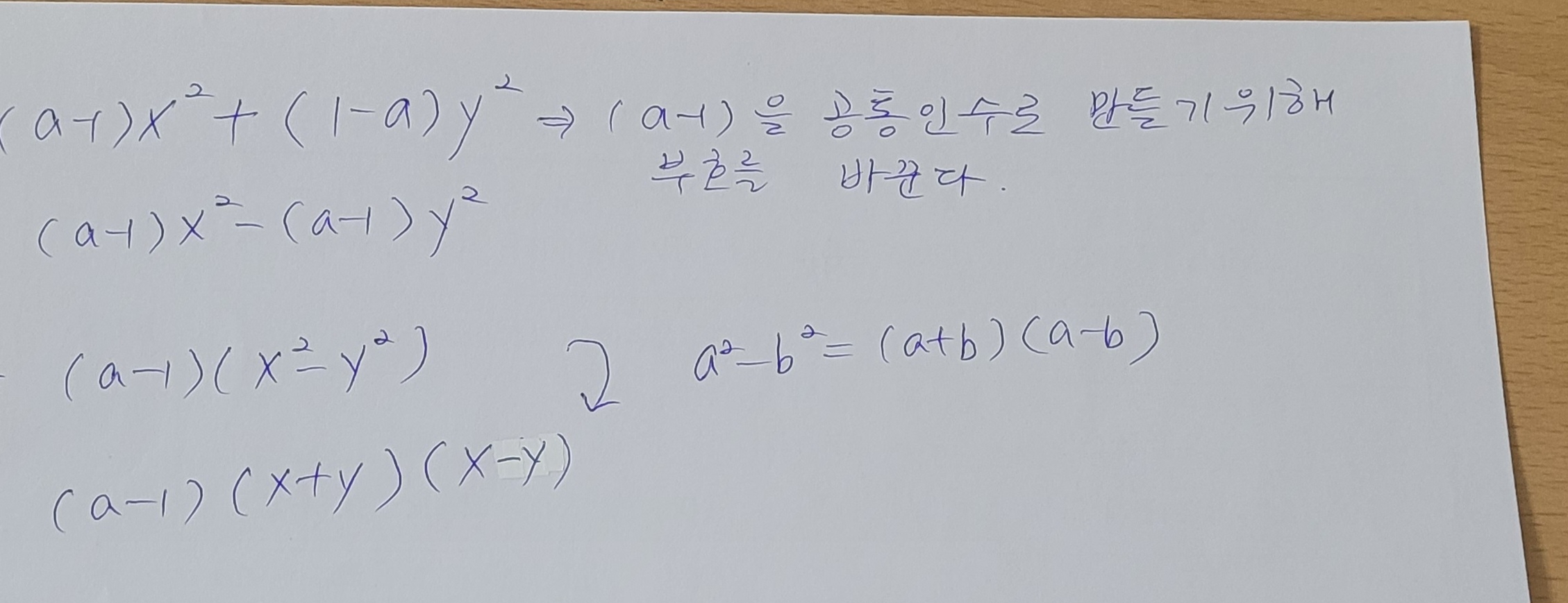 (a-1)x²+(1-a)y²를 인수분해 해야한다는데, 어떻게 푸는 건가요? 공식이 어떻게 되는지 알려주시면 감사하겠습니다.