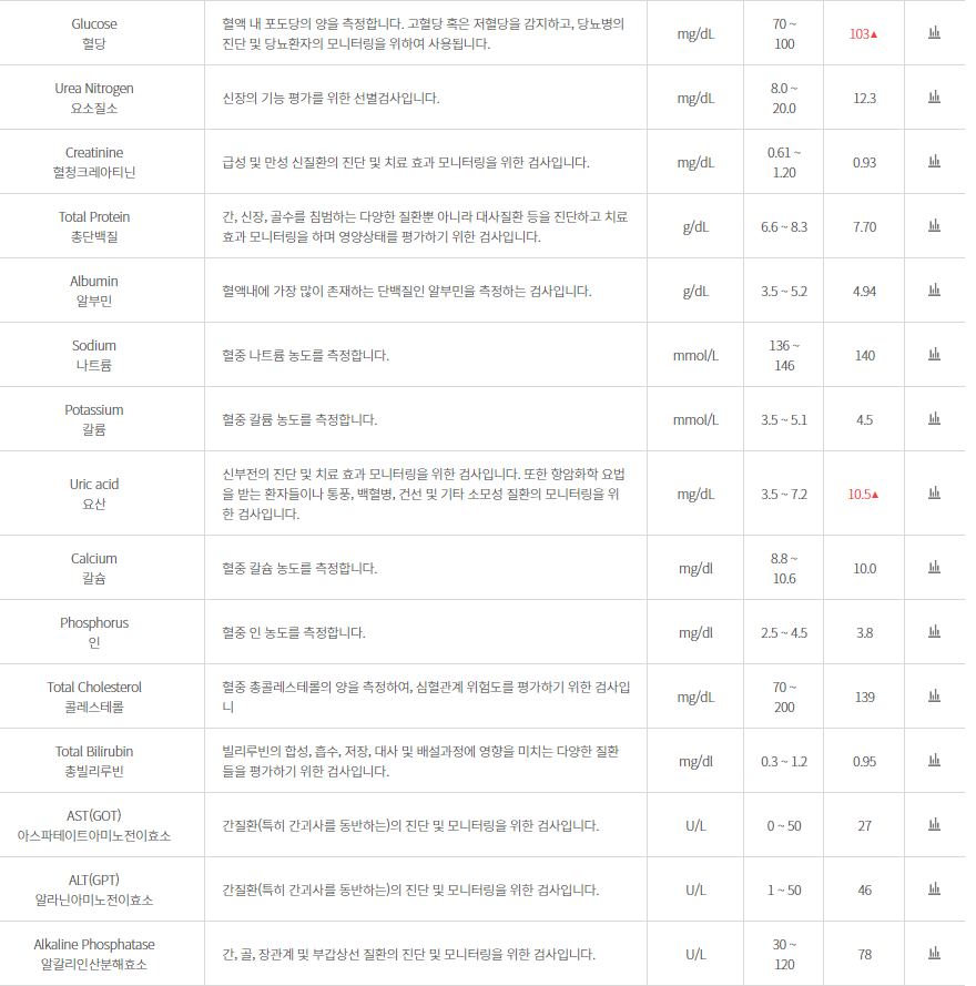 현재 요산수치가 지나치게 높으며 혈당은 공복이라는 가정하에 당뇨 전단계에 해당합니다.