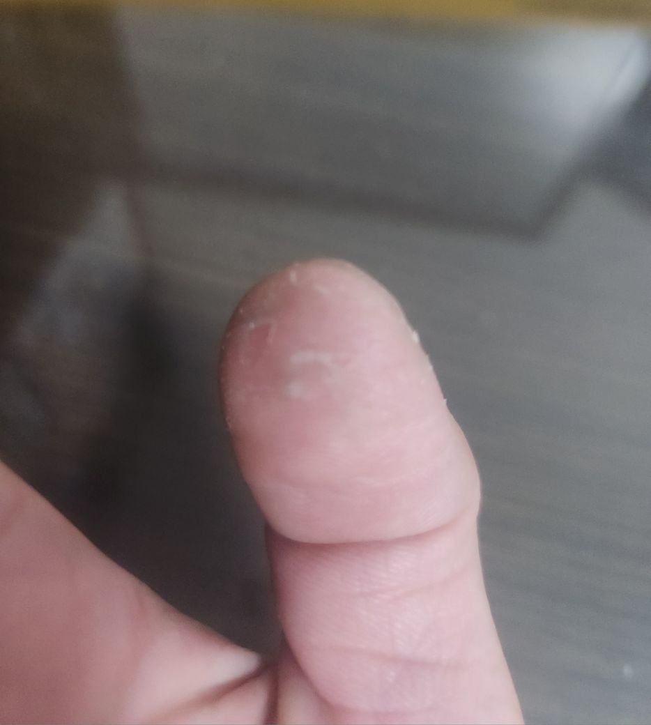 갑자기 저번주부터 손가락 끝에 저렇게 하얗게 심하게 일어나는데 뭐가 문제인가요? 습진?