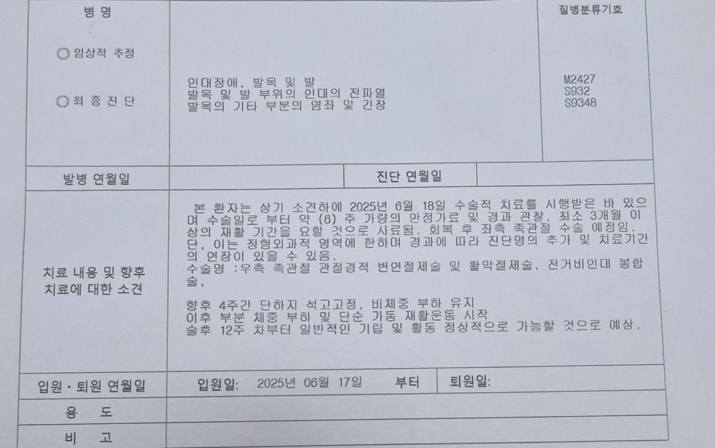 일단 진단서에는 12주차부터 기립 및 보행이 정상적으로 가능할 것이라고 써있고, 의사가 군생활에 가능한 뛰는것, 등산 이런활동은 6개월 정도 지나야 가능하다고 했습니다. 수술은 6월 18일에 받았고 6개월이면 12월경부터 런닝이 가능하다는 것인데, 좌측까지 수술하면 12개월이 필요하다는 것인데, 전역은 26년 5월 입니다. 약 군생활이 10개월 조금 넘게 남았는데 찾아보니 의병전역 판단 기준이 양측 부위의 병변, 치료기간이 6개월 이상이거나, 장기적 치료 필요성, 기능제한 이런게 기준이던데 혹시 이런 기준에서 판단 했을때 의병전역 신청 요건이 되는지 궁금해서 전문가 분들께 여쭤봅니다.