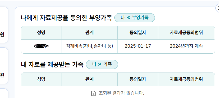 제가다시 3번째사진처럼 (아버지는 딸의 직계존속으로설정) 방금 자료제공동의를 설정하니깐 직계존속2번쨰사진으로나오는데요