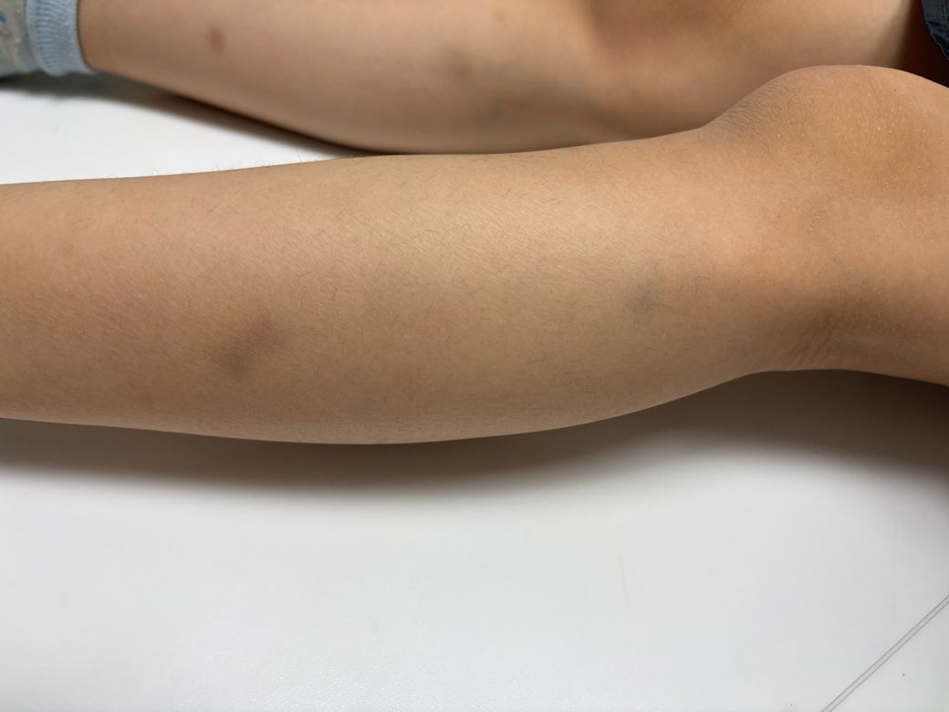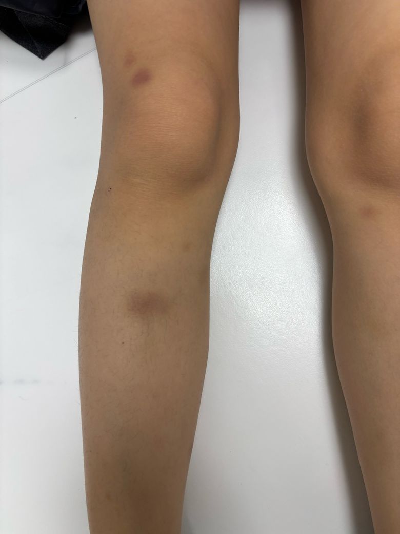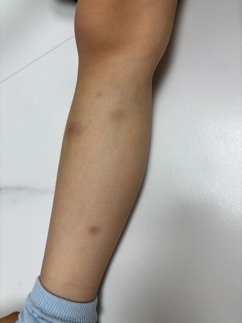 사진상으로는 양측 정강이와 무릎 주변에 다양한 크기의 멍(피하출혈)이 분포해 있고, 색이 갈색에서 보라색으로 섞여 있는 것으로 보입니다. 위치가 주로 정강이 앞쪽(경골 부위)인 점은 활동 중 외상, 특히 자전거 페달이나 부딪힘에 의한 타박으로 설명이 가능한 전형적인 부위입니다. 소아에서 이 부위 멍은 가장 흔한 양상입니다.