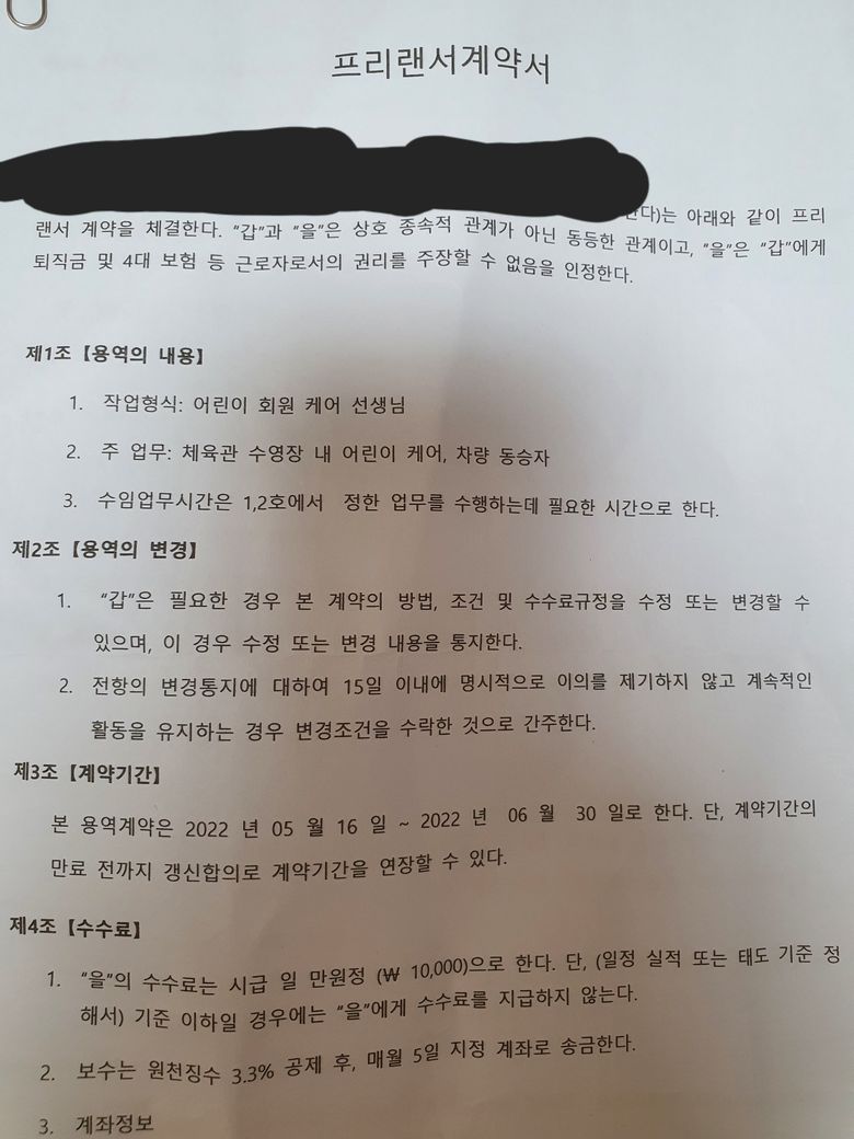 우선 제시해주신 계약서 자체가 근로계약서가 아닌 프리랜서 계약서이기 때문에 실질을 보아야 합니다.