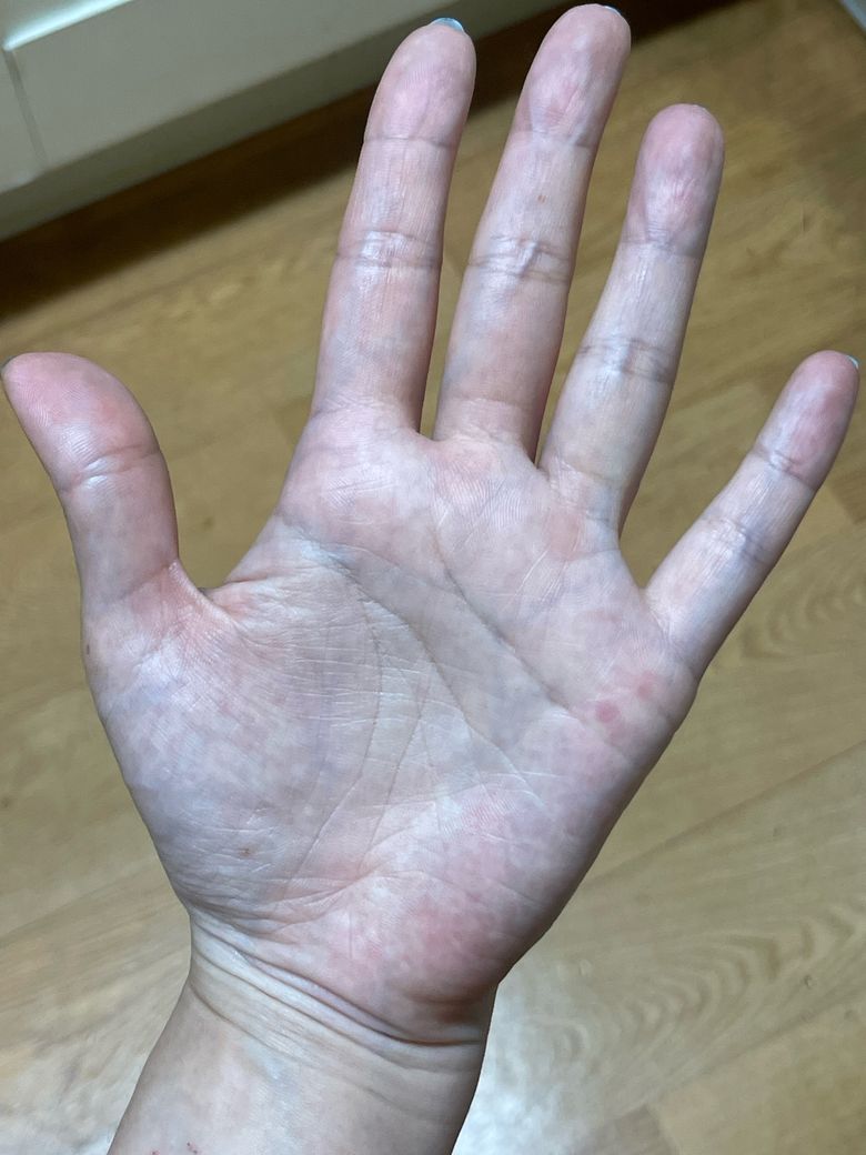 그런데 양쪽 손바닥 가장 자리가 저렇게 빨갛고 붉습니다.