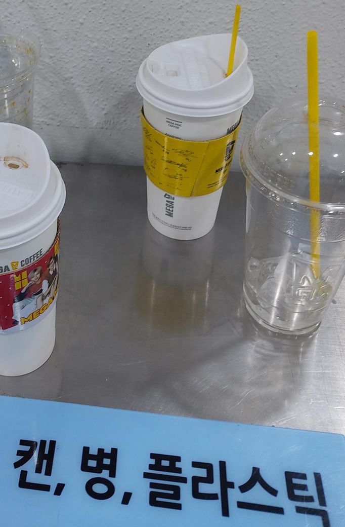 플라스틱용 쓰레기통 위에 커피 용기를 놔두는 이유는 무엇인가요?