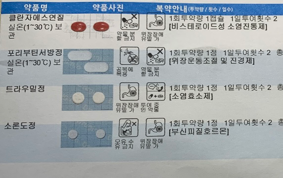 처방 받으신 약들 중에 졸음 부작용이 큰 약은 없습니다. 염증을 가라앉혀주는 약들이 많이 있네요. 소론도 정은 스테로이드 성분의 약으로 오래 복용하면 부작용이 있을 수 있는 약입니다.