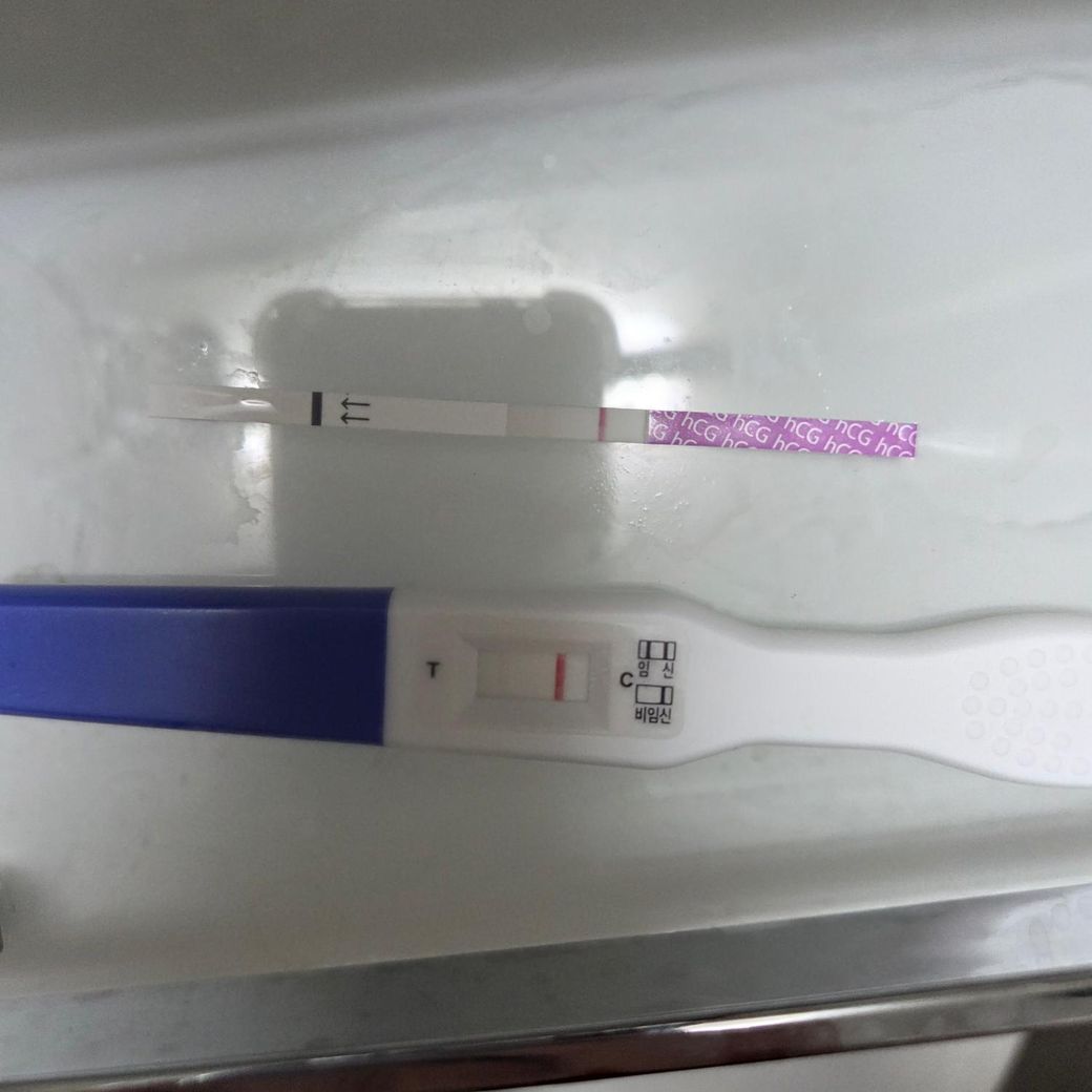 어떻게 해야 할까요? 이틀 지나면 선이 더 선명해진다고 하던데 미동도 없고 오히려 더 미세해진 것 같기도 하고 관계한지 2주도 훨씬 넘었는데 이렇게 미세하게 뜰 수가 있나요? 병원에 가봐야 할까요... 불안합니다 ㅜㅜ 일주일 전부터 생리통같은 복통이 계속 느껴지긴 했습니다... 오늘 새벽에도 그랬고요... 조만간 생리를 하려는 걸까요? 아침 첫 소변 맞고 4-5분 경과 후에 촬영했습니다.
