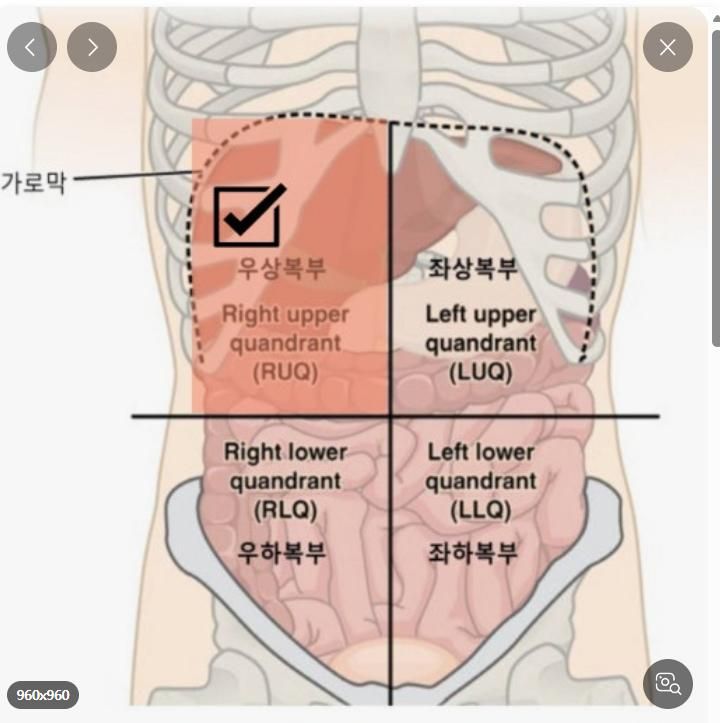 평소에 우상복부 전체적으로 통증 약간 느껴지고 주먹으로 그쪽부분 팍팍 치기도하고 손가락으로 갈비뼈 안쪽으로 말랑말랑한 부분 꾹꾹누르기도하는데 으악 할정도에 통증은 없습니다.