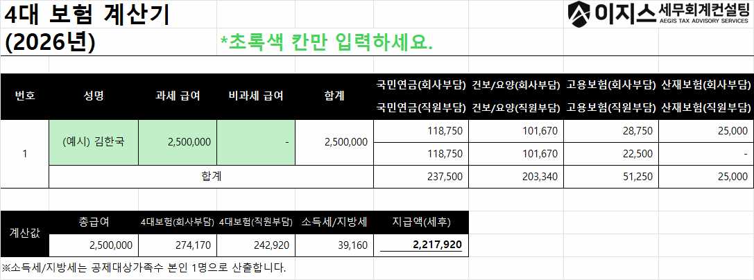 세전 급여 250만원인 경우 사대보험 예상금액은 다음과 같습니다.