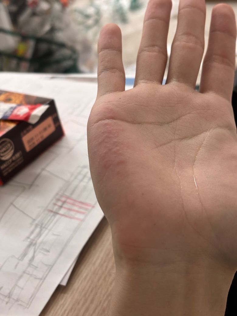 사진상 손바닥에 국소적으로 홍반이 도드라진 형태는 비교적 흔한 다음 원인들과 양상이 유사합니다.