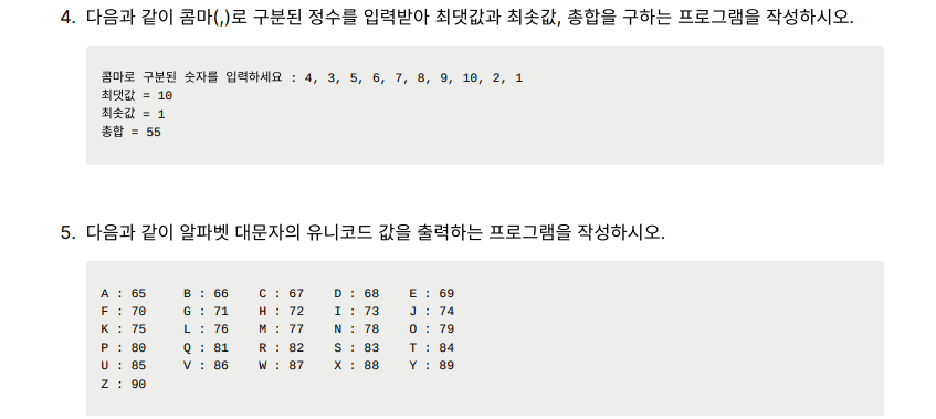 #4. 다음과 같이 콤마(,)로 구분된 정수를 입력받아 최대값과 최소값, 총합을 구한느