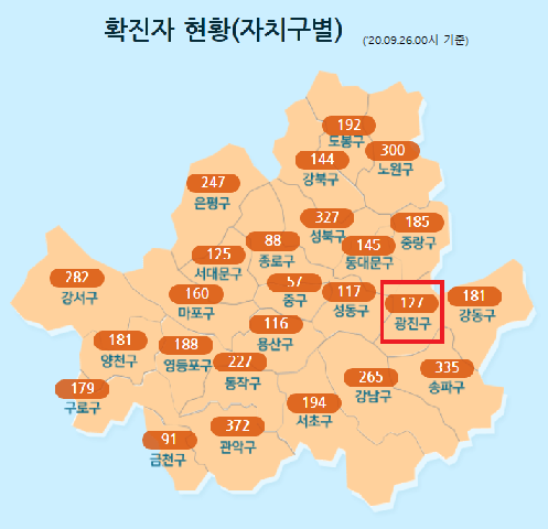 질문하신 내용에 대하여 아래와 같이 답변 드립니다.건대입구가 위치한 광진구의 코로나19 확진자 현황입니다.