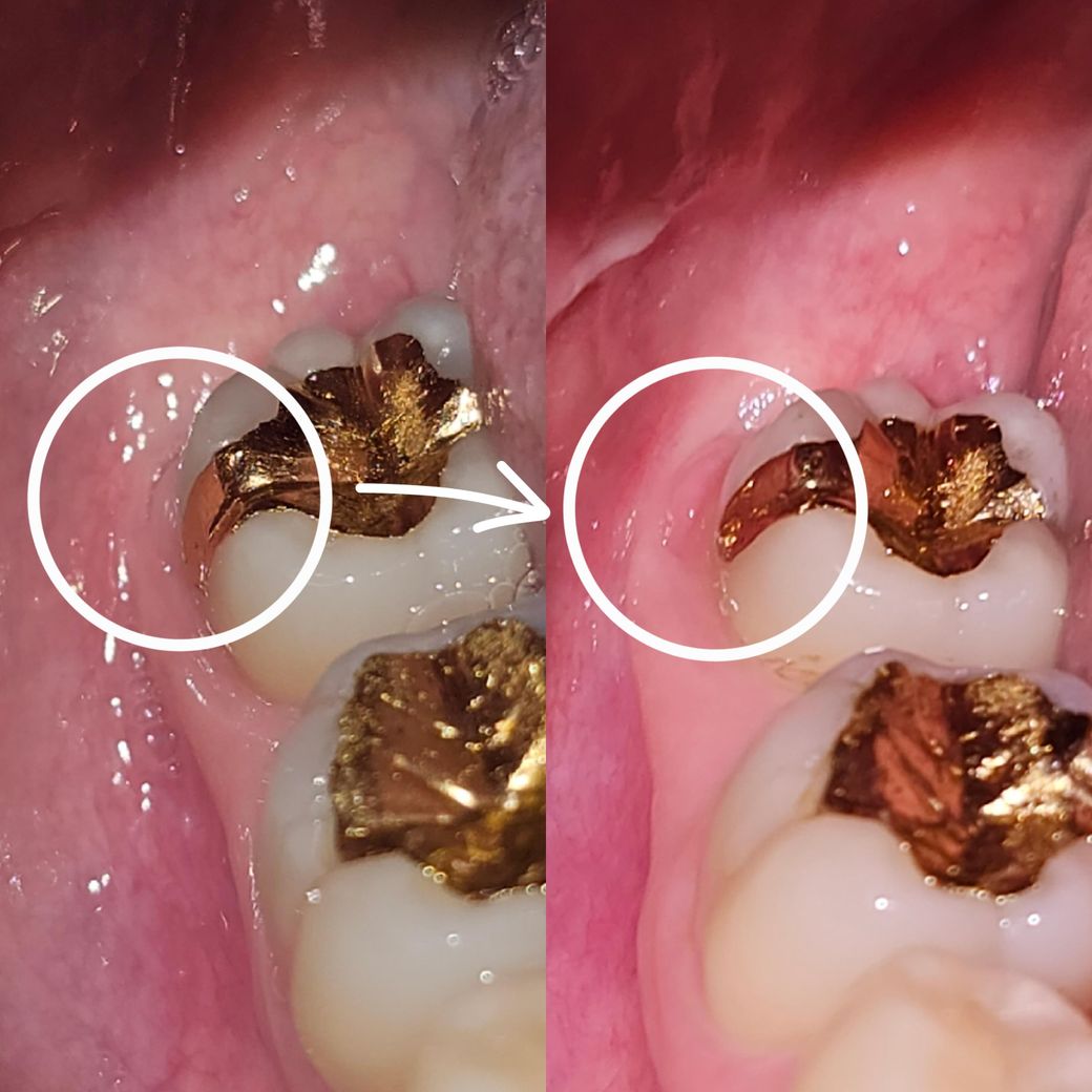 사진으로 봤을 땐 잇몸이 외부 자극으로 인해서 자극된 것으로 보입니다. 양치질을 하거나 다른 원인으로 인해서 잇몸에 자극이 되면 잇몸이 자라나오는 경우가 있습니다. 이런 경우 해당 자극을 줄이면 원래 상태로 돌아가는 경우도 있습니다.