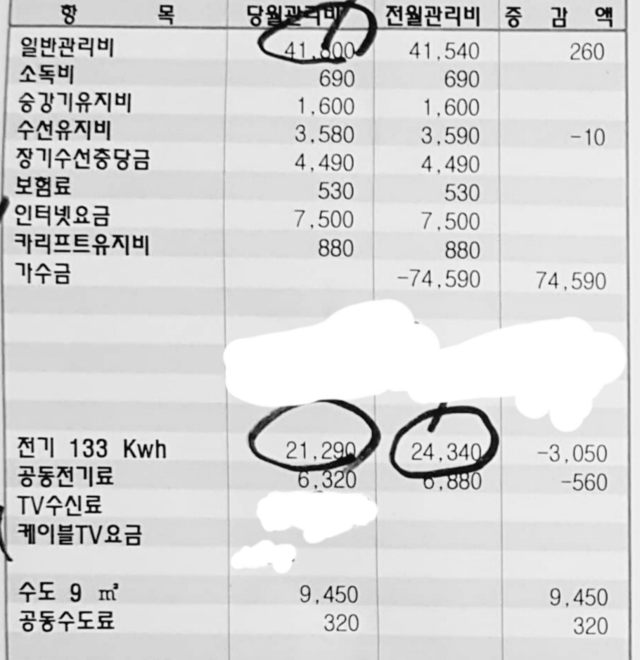 전월관리비 : 전기, 공동전기료 (7-8)