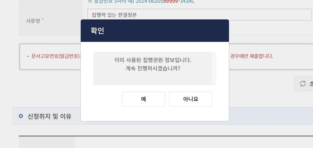 첨부한 사진처럼 "이미 사용된 집행권원 정보입니다" 라고 나왔어요.