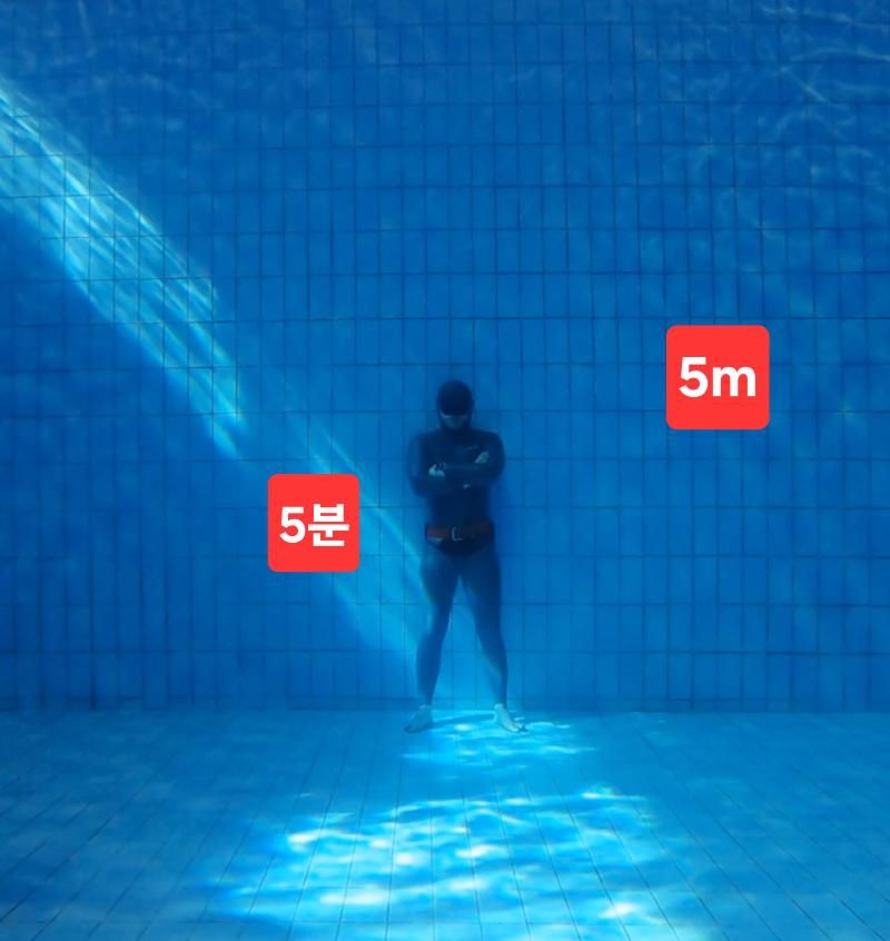 어쨌든 그런 이론적 바탕에서, 스킨스쿠버 일반적 수중 활동이 아닌 경우로서, 슈트, 공기통 등 장비를 전혀 착용하지 아니한 일반 운동복만 입고 민물 수영장 5m 바닥에서 5분간 있고자 한다면 양성 부력 으로 육체가 떠오르지 않게 음성 부력을 유지하고자 하면 최소 몇 kg의 웨이트를 몸에 부착해야 되는 것인가요?