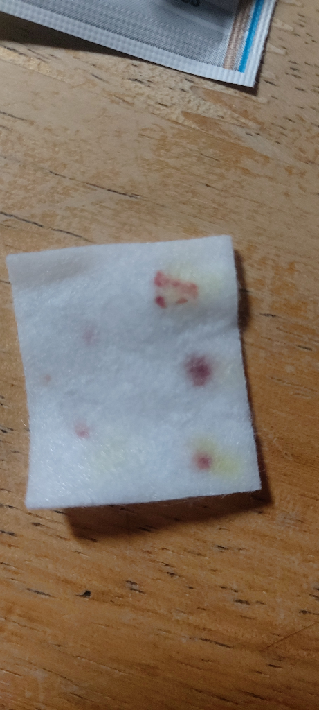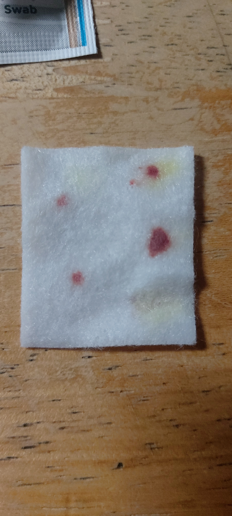 당검사를 위해 채혈 후 소독솜으로 꽉 누른경우에 이런일이 일어나는지요? 앞서 노란색이 번진 소독지는 처음 한 것이고 두번째 번지지 않는 소독지는 다시 해본 것 입니다