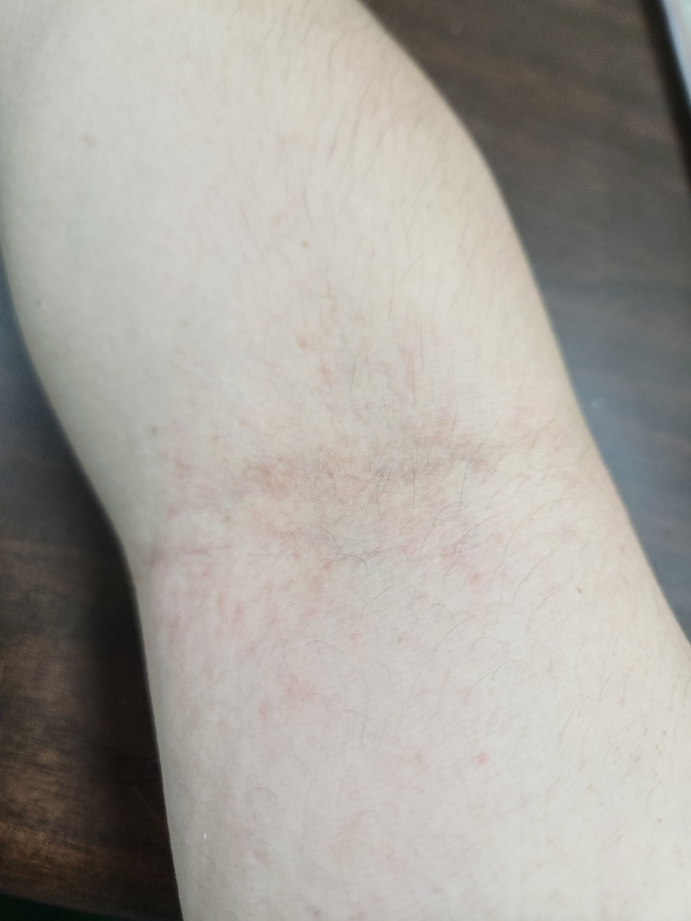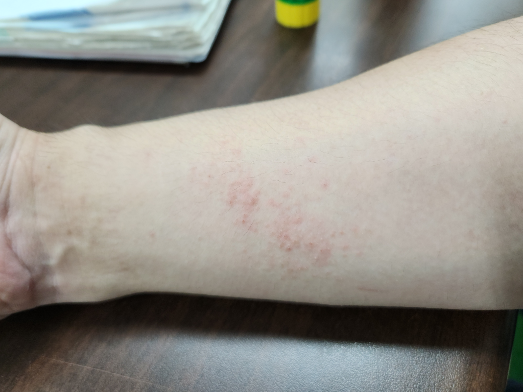 땀띠의 가능성도 있지만 접촉성 피부염 등의 알레르기 질환의 가능성이 더 높아보입니다.