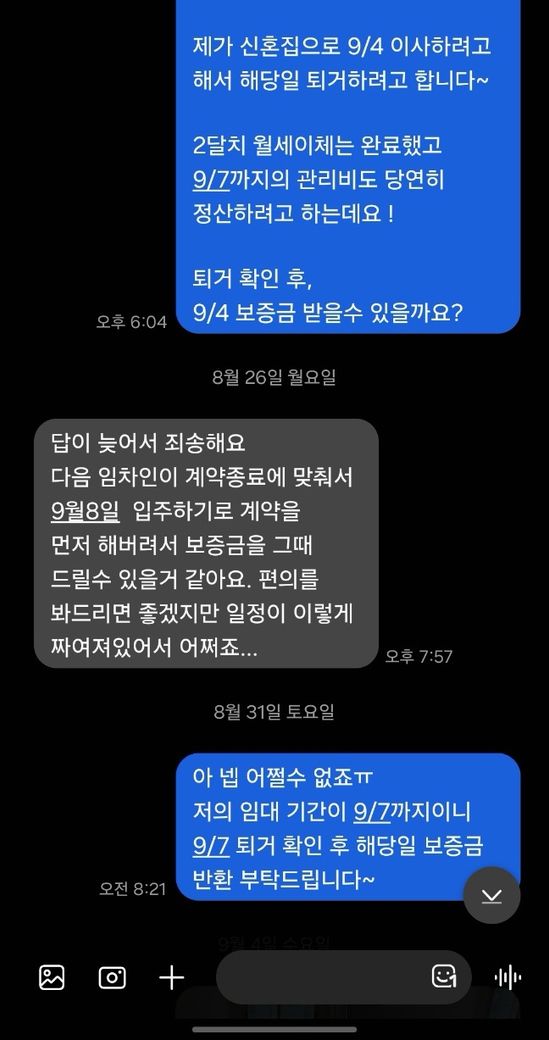 9/8 다음 임차인 입주예정이니 보증금 받아 전달해주겠다고 합니다.