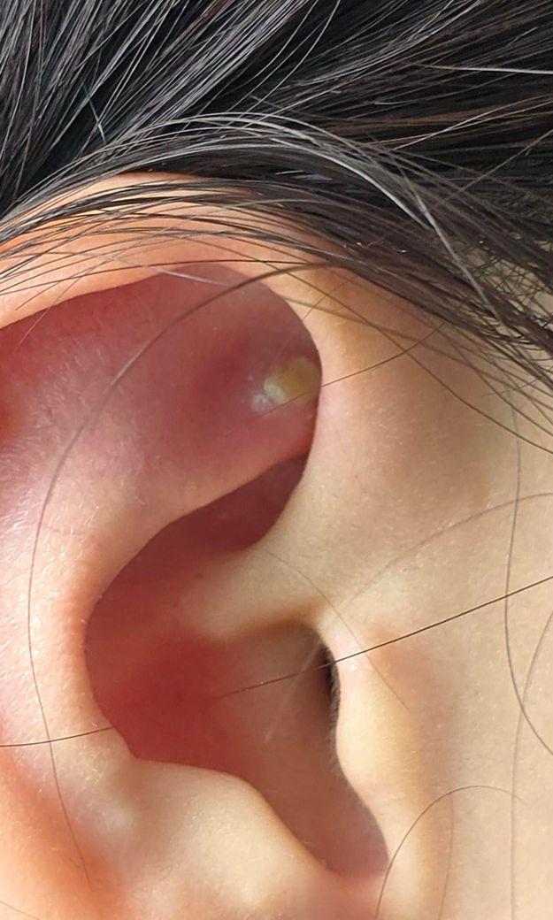 일주일 전부터 귓바퀴에 이상한 게 만져지더니 어제 자극을 좀 줬더니 하얗게 바뀌었어요 ㅠㅠ 원래는 안 아팠는데 지금은 만지면 아프네요 어제 꾹 눌렀을 때 진물이나 피 같은 건 안 나왔어요