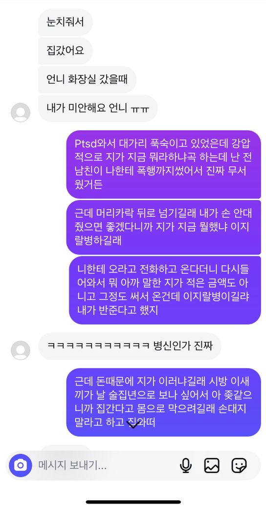 너무 화나고 무서워서 그냥 집간다고하니 나가려는 절 몸으로 안아막으며 못가게하길래 한번만 더 몸에 손대면 고소한다고하고 집에 갔습니다.
