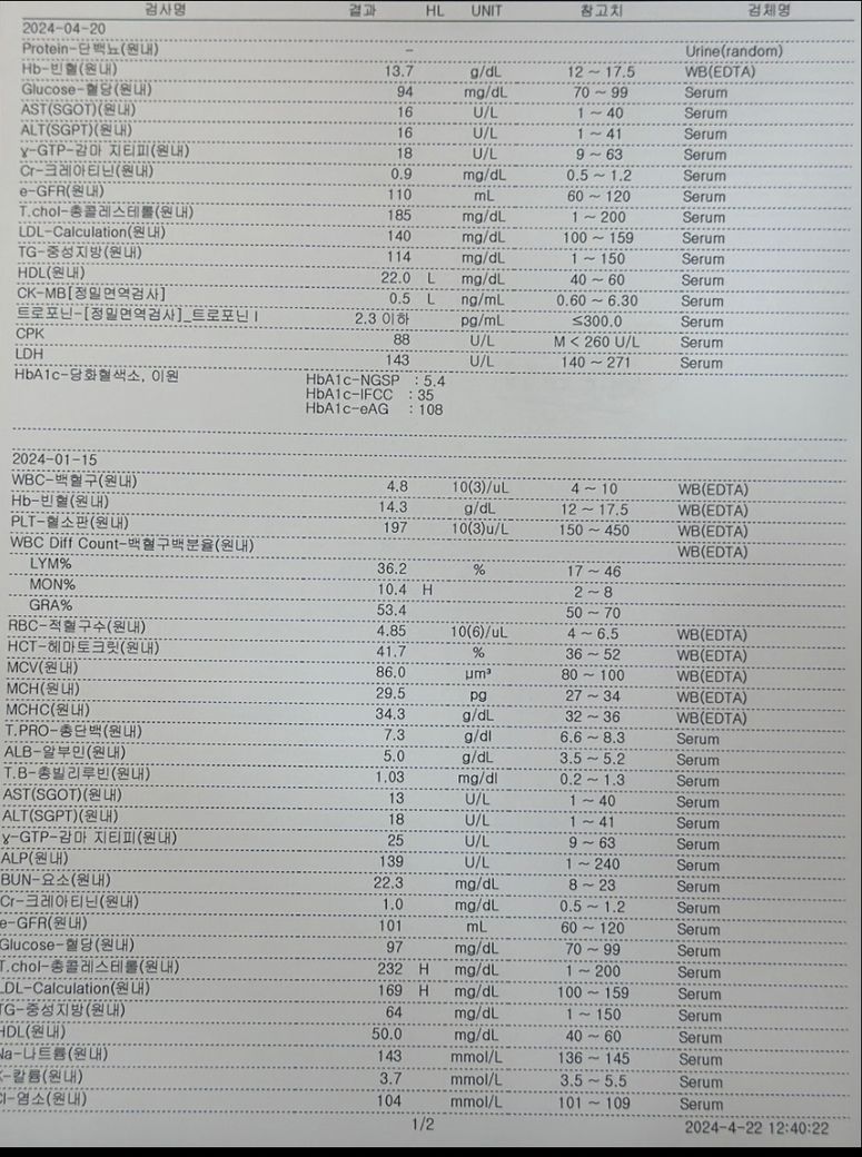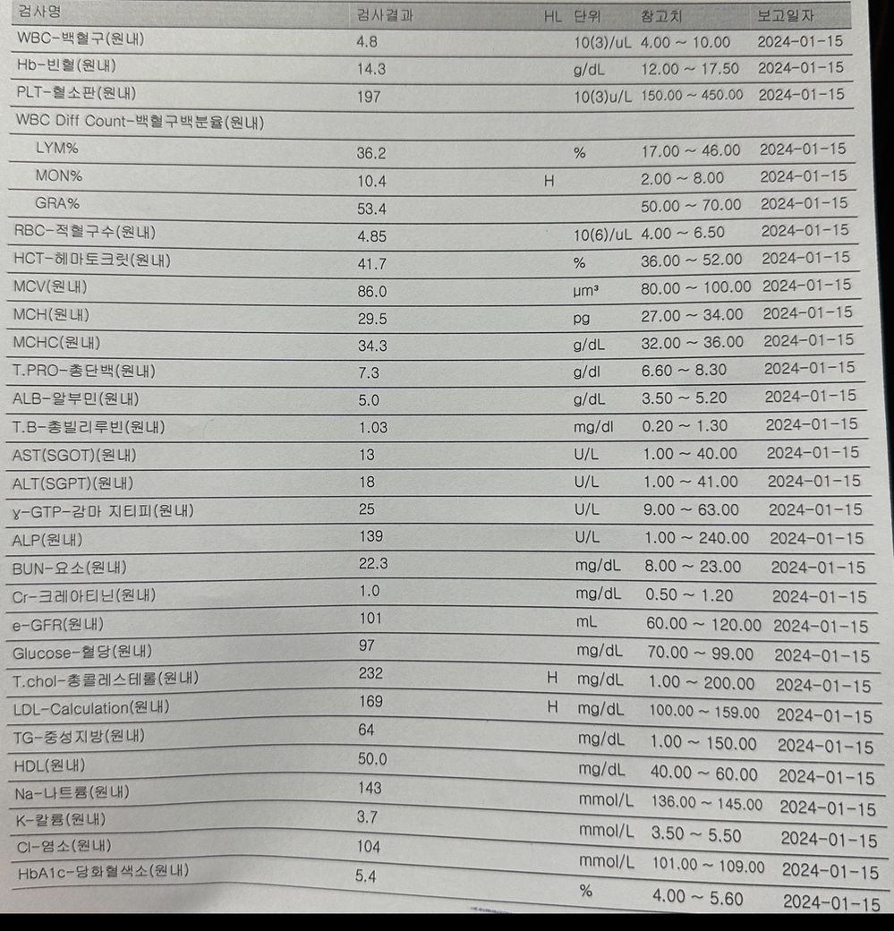 올려주신 결과에서 고지혈증 소견이 확인되므로 공복으로 병원을 방문하여 재검을 받으시고 결과에 따라 약물치료 상담을 받기 바랍니다.