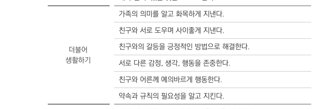 공동체 의식을 기르기 위해서는 다른 친구에게 기회를 양보하기, 차례를 기다리기, 다른 친구를 배려하기, 공동의 목표를 달성하는 과업 수행하기 등을 활용할 수 있습니다. 구체적으로는 아래의 교육과정을 참조해 보시기 바랍니다.