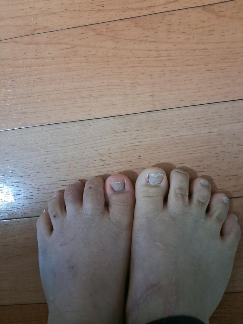 왼발이 다쳤는데....오른발이랑 비교했을때 다친발가락이 동그랗게 빨게요ㅠㅠ...그리고 아픈데 이거 괜찮아질까요??다친지 6일정도 됐어요ㅠㅠ
