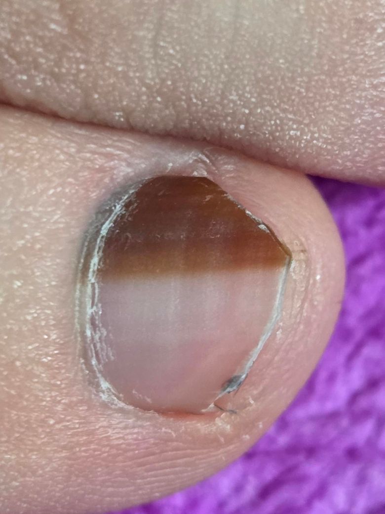 사진에서 보이는 병변은 발톱의 절반 이상을 차지하는 갈색에서 흑색 색소 변화로, 단순한 외상성 출혈보다는 색소성 병변 양상에 가깝습니다. 특히 5년 이상 지속되면서 점차 크기가 증가했고, 발톱을 넘어 주변 피부에도 색소가 보인다는 점이 중요합니다. 일반적인 조갑하 혈종은 시간이 지나면서 발톱이 자라며 앞쪽으로 이동해 사라지는 경향이 있어, 현재 경과와는 맞지 않습니다.