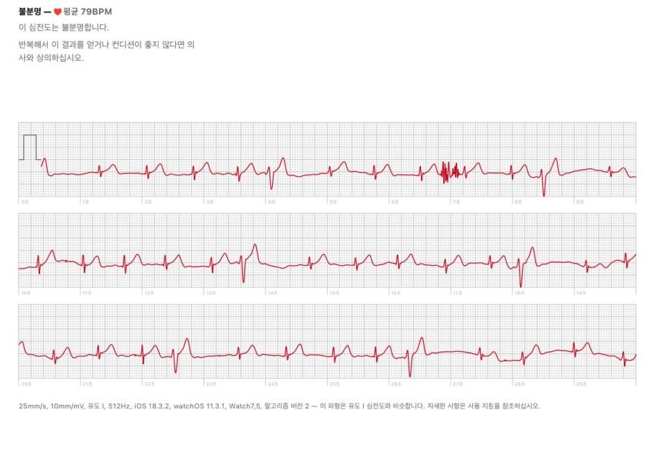웨어러블 기기를 통해 기록된 것으로 보이며 평균 심박수는 79bpm, 7초 전후 심전도 이상파형이 보입니다. 군데군데 심실조기수축 양상 보이며, 노이즈처럼 보이는 부분은 검사상 움직임에 의한 오류로 보입니다.