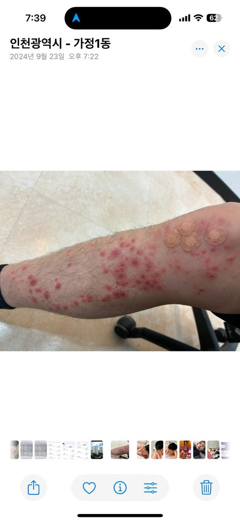 우선 다리에 붉은 발진과 염증성 병변이 다수 분포해 있는 것으로 보입니다. 이런 증상은 다양한 원인이 있을 수 있는데, 알레르기 반응, 접촉성 피부염, 모낭염, 곤충 물림, 피부 감염 등이 그것입니다.