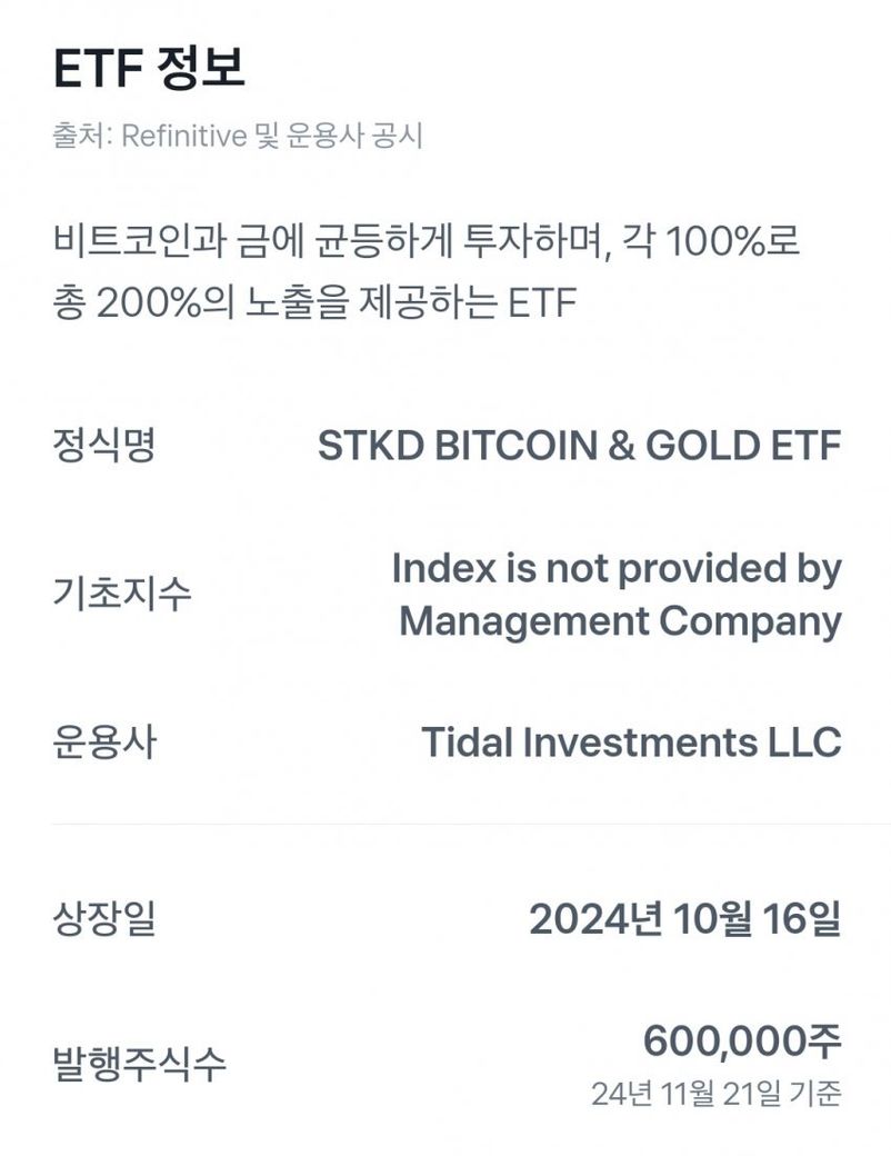1명 평가해당 상품의 티커는 btgd인데 비트코인과 금을 쌓는방식으로 결합한 스택드 투자방식으로 최초 etf랍니다. 1달러당 1달러 이상의 노출을 달성한다고 합니다.