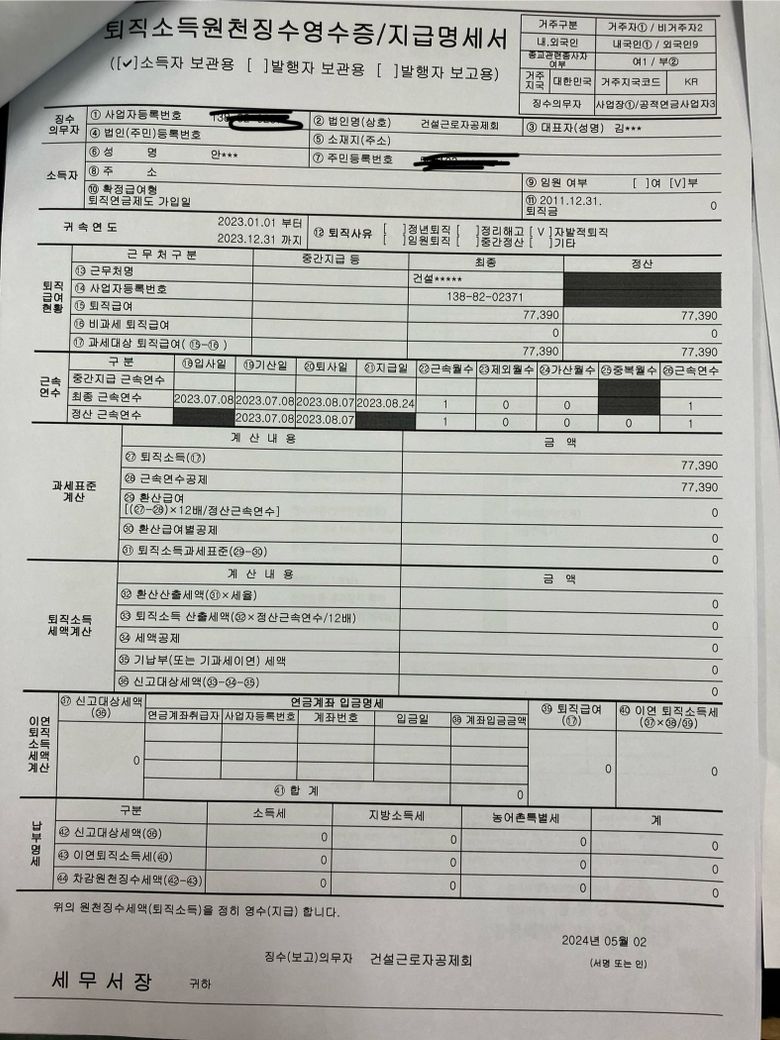 아래와 같은 퇴직소득원천영수증을 받았습니다