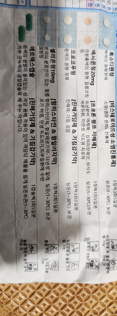 현재 복용 중인 의약품은 순서대로 소염진통제, 위장약, 기침약, 콧물약, 가래약입니다.