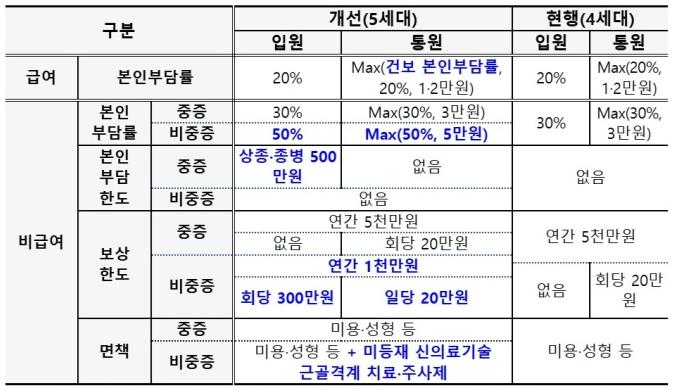 : 4세대와 5세대의 차이는 상기표와 같이 급여의료비에 대해서는 본인부담금 20%로 동일하나,