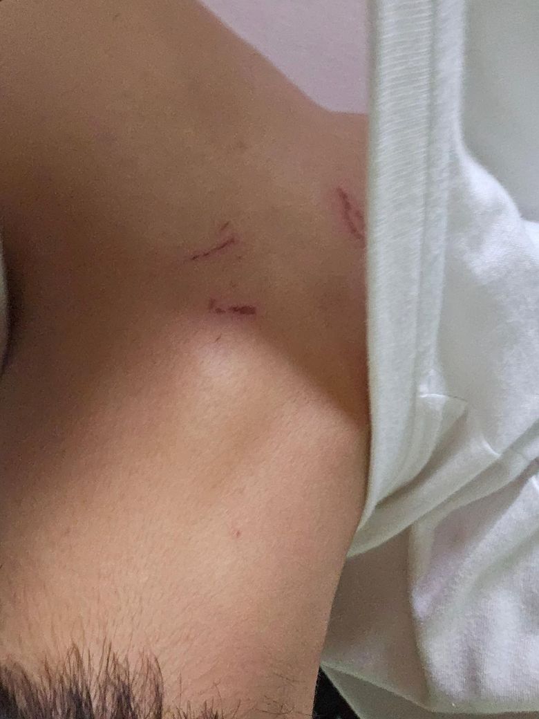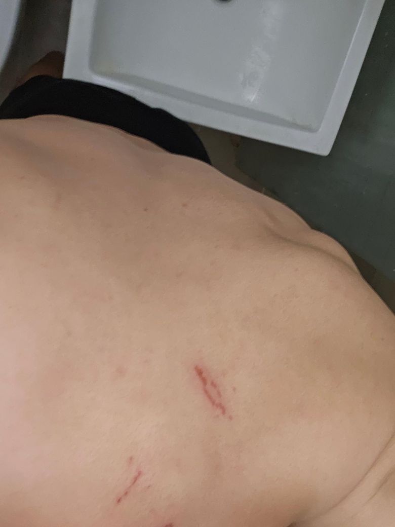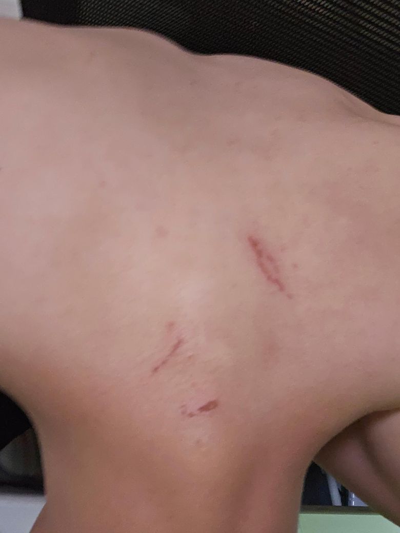 사진상 얕은 찰과상으로 추정되는 병변이 여러 군데 관찰되고 있어 수면 중 본인도 모르는 사이 몸을 긁으면서