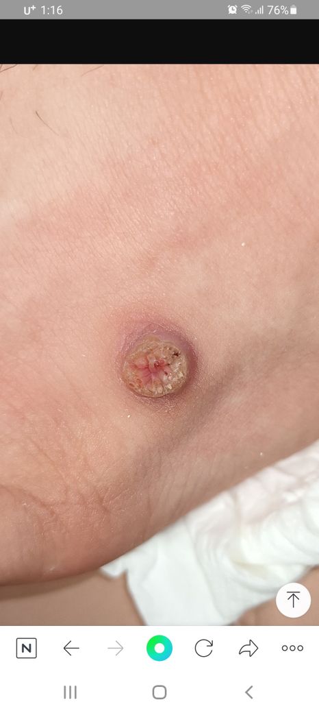 현재 언급하신 병력과 사진으로는 2차 세균 감염의 가능성이 있어 보이며 해당 부위 병변이 크므로 외과에 내원하시어 물리적 제거가 가능한지 확인해보시는 것이 가장 좋겠습니다.