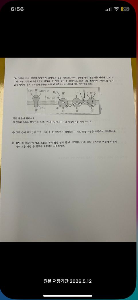 사진 속 문제는 미토콘드리아의 전자 전달계(ETC, Electron Transport Chain) 와 관련된 세포 호흡 과정을 묻고 있습니다. 우선 그림에 대해 설명해보자면 다음과 같습니다. 그림은 미토콘드리아의 내막에서 전자 전달계가 일어나는 모습을 나타내는데요, ○는 NADH와 FADH₂가 각각 전달하는 전자를 따라 전자전달계를 구성하는 막단백질 복합체를 의미합니다. 이때 (가)는 ATP 합성효소, (나)는 막단백질 복합체 중 하나이며, H⁺는 막을 따라 농도 기울기 형성에 관여하며, ATP 생성에 필수적입니다. (가)는 ATP 합성효소 (ATP synthase)로, H⁺가 농도 기울기에 따라 막을 따라 내부로 확산되며 ATP 생성도비니다. (나)는 전자전달계 단백질 복합체 (예: 복합체 I, III, IV)로, H⁺를 능동수송(펌프)으로 막 바깥(막사이공간)으로 내보내는데요, 이는 NADH나 FADH₂로부터 받은 전자의 에너지를 이용합니다. H⁺의 이동방식에 대해 정리해보자면, (가)는 확산(수동수송), (나)는 능동수송입니다. 또한 포도당 1분자는 NADH 10개, FADH₂ 2개 생성하게 됩니다.
