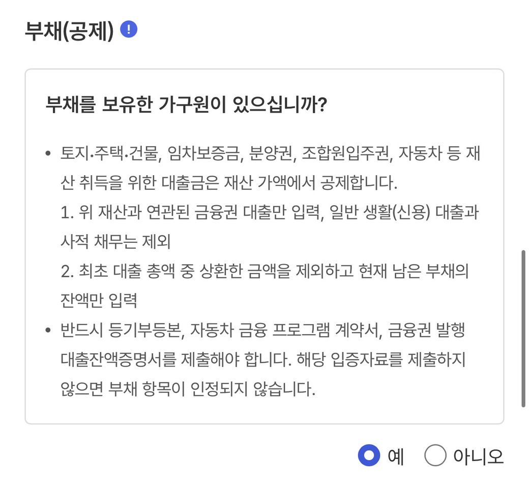 부모님 명의로 **주택을 보유하고 있고, 그 주택에 담보대출이 끼어 있다면 ‘부채 있음(예)’**을 선택하시는 게 맞습니다.