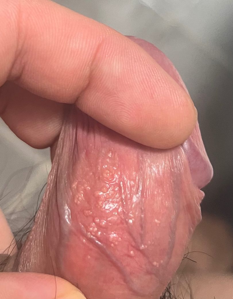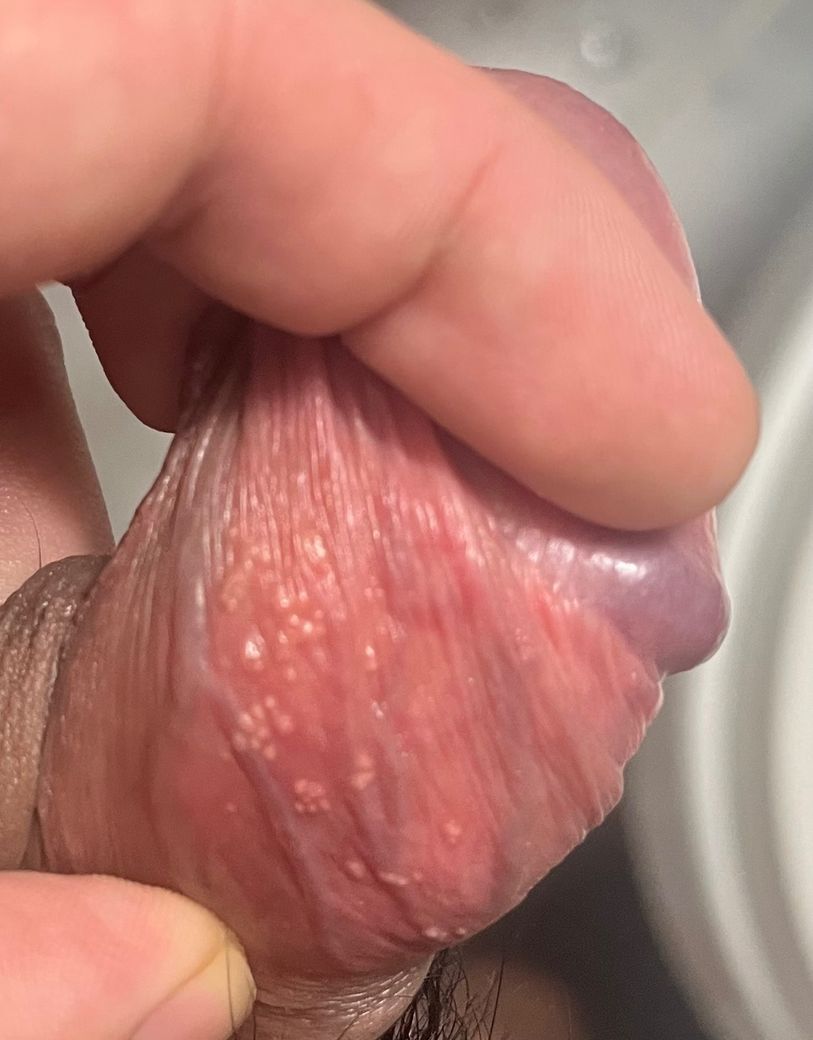 올려주신 사진으로 미루어 헤르페스 감염보다는 포다이스 구진이 더 생각되나 성 경험이 있으므로 감별을 위해 비뇨기과 진찰과 검사를 받아 볼 것을 권합니다.