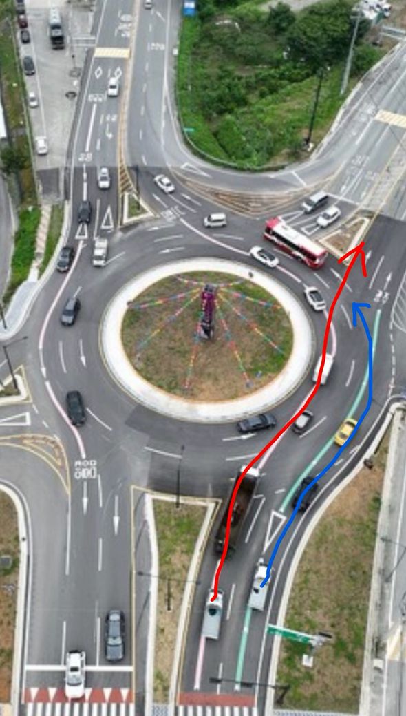 2차선 회전교차로에서 사고 났습니다. 저는 6시 방향 2차로 진입후 12시로 나가려고 하였으며, 상대는 6시 방향 1차로 진입후 3시 방향으로 나가려고 하다가 사고가 났습니다.